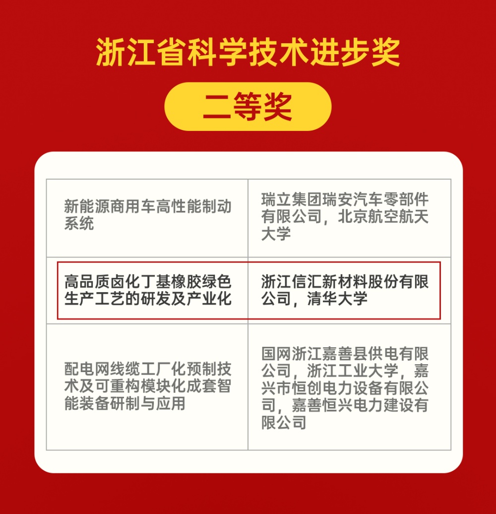 浙江信匯新材料股份有限公司和清華大學(xué)合作完成的“高品質(zhì)鹵化丁基橡膠綠色生產(chǎn)工藝的研發(fā)及產(chǎn)業(yè)化”項目獲得浙江省科學(xué)技術(shù)進步獎二等獎。