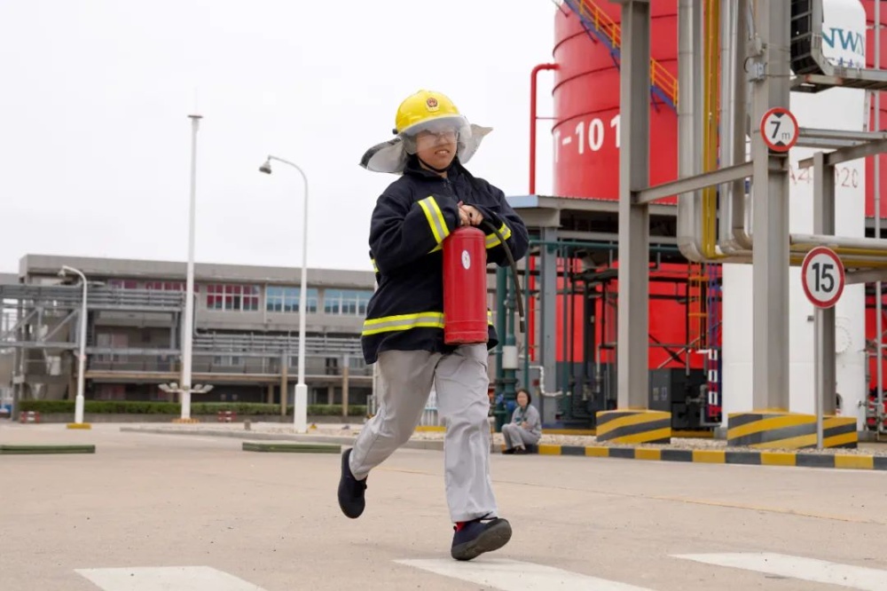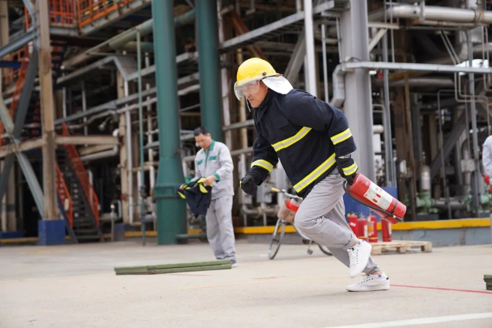 本次比武設(shè)HSE知識(shí)競(jìng)賽、佩戴空呼器著防化服、油桶滅火、三人三帶接力出水擊靶等四個(gè)項(xiàng)目。 盡管盛夏六月驕陽似火,但并沒有阻擋參賽選手們的熱情。在佩戴空呼器著防化服項(xiàng)目中,選手兩兩一組配合默契,從檢查到操作每個(gè)步驟都有條不紊絲毫不差。在三人三帶接力比武現(xiàn)場(chǎng),參賽選手們斗志昂揚(yáng)、奮勇拼搏,快速完成了分水器連接、水帶展開、加壓和擊靶等動(dòng)作。